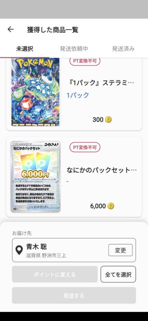 獲得したカードは発送してもらうか、ゲーム内で売却してポイント化できます。