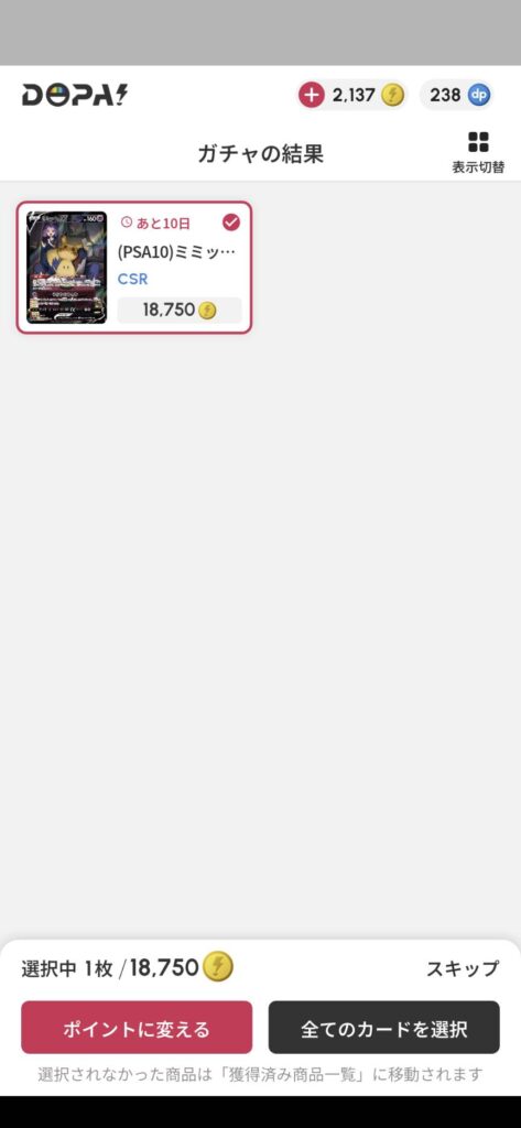 ランダムでカードを引き、当たりが出れば高額カードが手に入る仕組み。